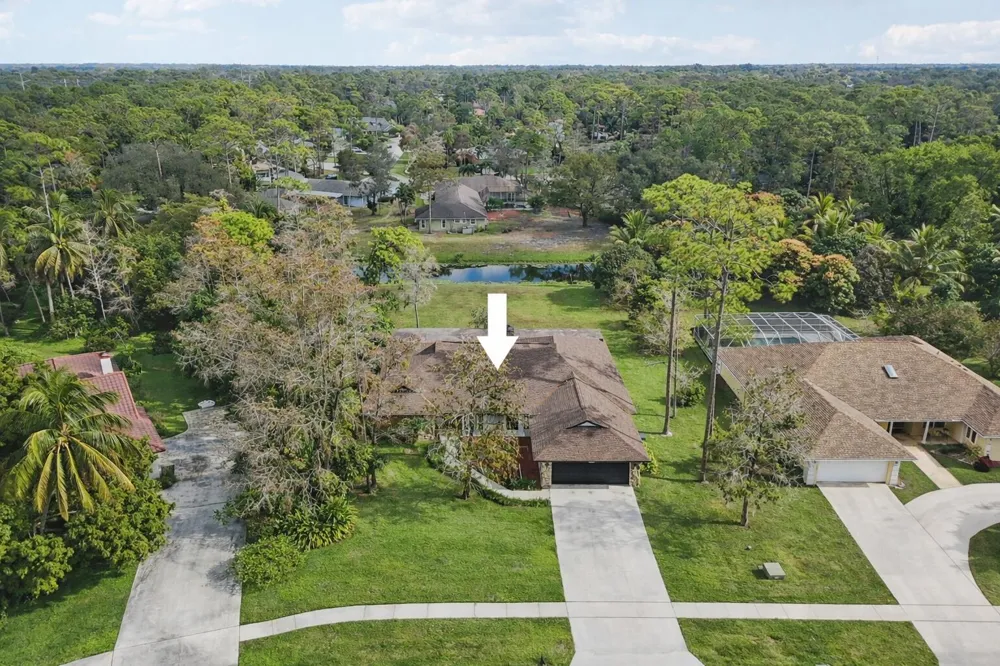 Welcome to 13253 La Mirada Circle, a 4-bed, 2.5-bath single-level home with 3,060 sq. ft. under air, located on an interior canal in Wellington's non-HOA community of Pinewood Grove. Situated on an oversized 1/2-acre pie-shaped lot, the home features key updates including: exterior paint (2025), exterior lighting (2025), interior LED high hats (2025), hot water heater (2024), roof (2022), impact windows (2020), impact doors (2020), and an A/C replaced in 2020. This home features an open split floor plan with tile flooring throughout the main living areas, vaulted tongue-and-groove wood ceilings, and a fireplace in the main living room. The generous primary suite includes a walk-in closet with built-in shelving, while both full bathrooms feature dual sinks. Additional highlights include a separate laundry room with sink, central vacuum system, screened-in porch, and two-car garage. The expansive yard provides room for a pool, summer kitchen, and allows space to permit an ADU, offering flexibility for future use. Conveniently located near Wellington Elementary via a neighborhood cut-through, Wellington Landings Middle, Wellington High School, shopping, dining, and all major equestrian venues. Home is priced with updating in mind to allow for personalization.